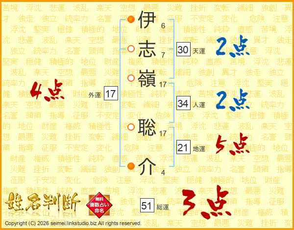伊(6画)志(7画)嶺(17画) 聡(17画)介(4画)