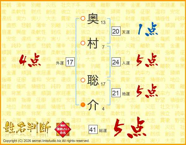 奥村聡介さんの地運は21画の5点!