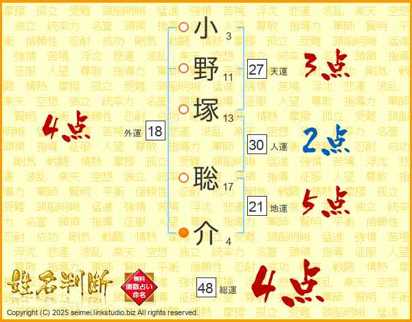 小(3画)野(11画)塚(13画) 聡(17画)介(4画)