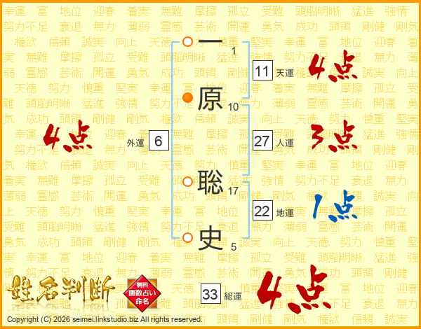 あなたの人生を表す1番重要な運勢です。生涯を通じて影響する総合運となり、主に50歳以降の晩年期に影響を及ぼします。苗字と名前の合計画数。