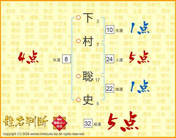 下村聡史さんの総運は32画の5点!