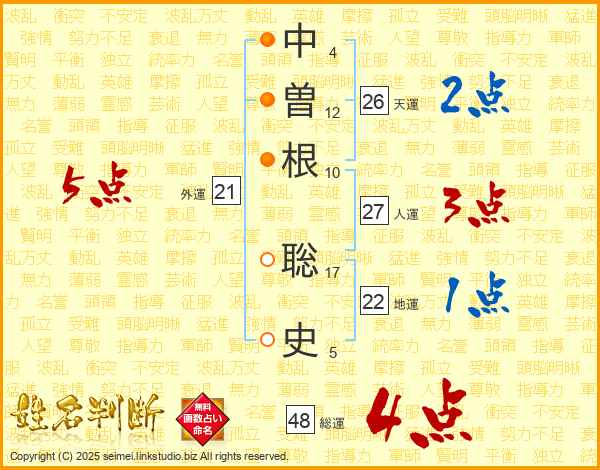 中(4画)曽(12画)根(10画) 聡(17画)史(5画)