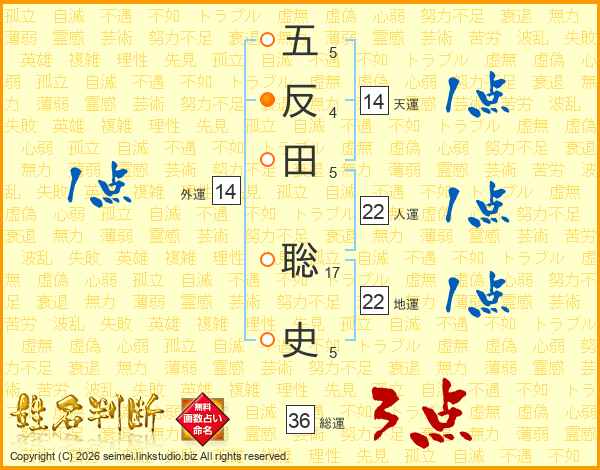 五(5画)反(4画)田(5画) 聡(17画)史(5画)