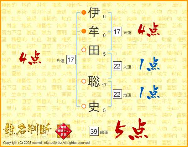 伊(6画)牟(6画)田(5画) 聡(17画)史(5画)