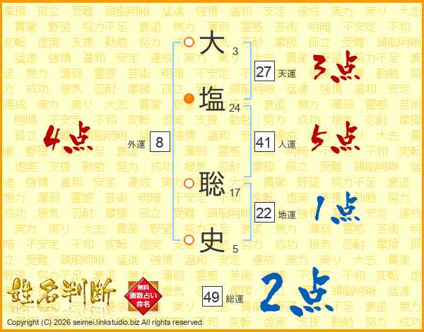 大(3画)塩(24画) 聡(17画)史(5画)