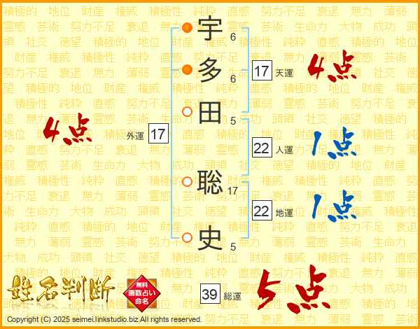 宇(6画)多(6画)田(5画) 聡(17画)史(5画)
