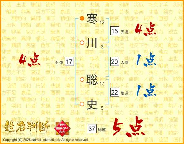 寒川聡史さんの総運は37画の5点!