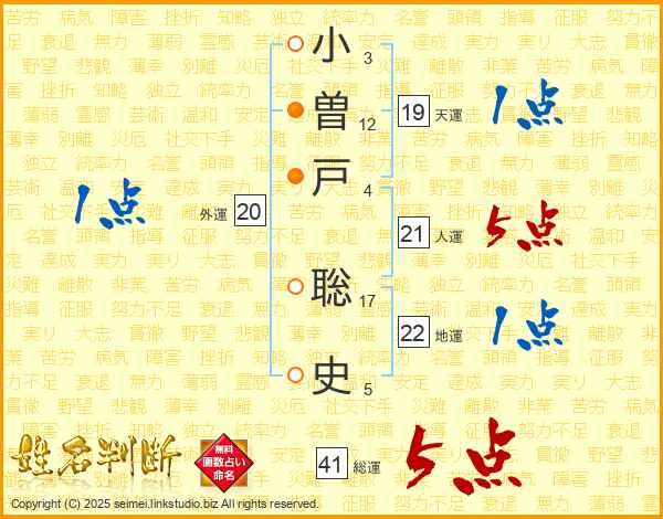 小(3画)曽(12画)戸(4画) 聡(17画)史(5画)