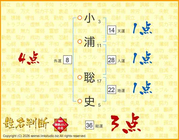 生活面を象徴する運勢です。外部から受ける影響力を表し、結婚運、家庭運や職場、環境への順応性を表します。総運から人運を引いた画数。姓や名が1文字の場合を除く。