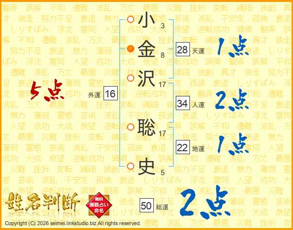 小(3画)金(8画)沢(17画) 聡(17画)史(5画)