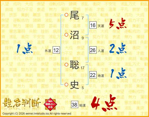 尾沼聡史さんの総運は38画の4点!