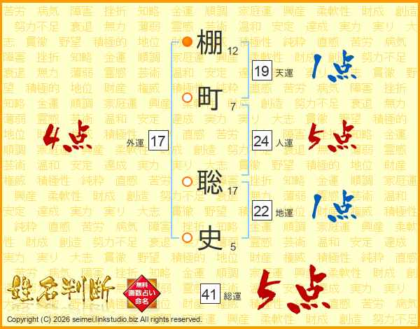 あなたの人生を表す1番重要な運勢です。生涯を通じて影響する総合運となり、主に50歳以降の晩年期に影響を及ぼします。苗字と名前の合計画数。