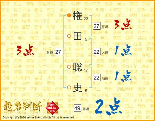 権(22画)田(5画) 聡(17画)史(5画)