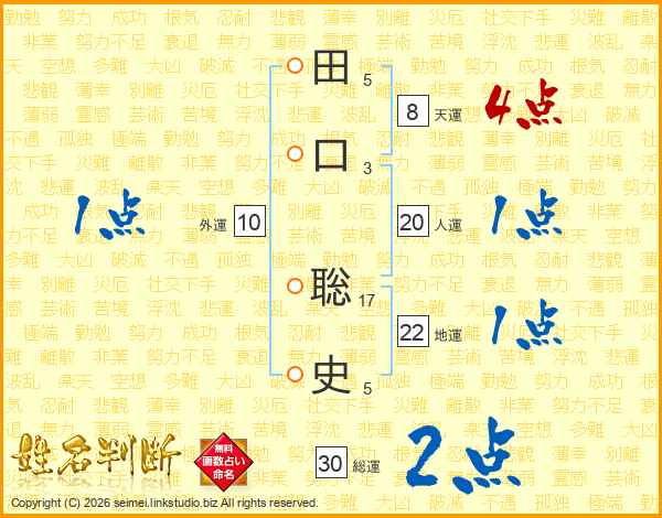 生活面を象徴する運勢です。外部から受ける影響力を表し、結婚運、家庭運や職場、環境への順応性を表します。総運から人運を引いた画数。姓や名が1文字の場合を除く。
