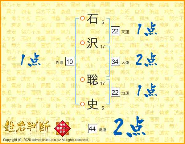 あなたの人生を表す1番重要な運勢です。生涯を通じて影響する総合運となり、主に50歳以降の晩年期に影響を及ぼします。苗字と名前の合計画数。