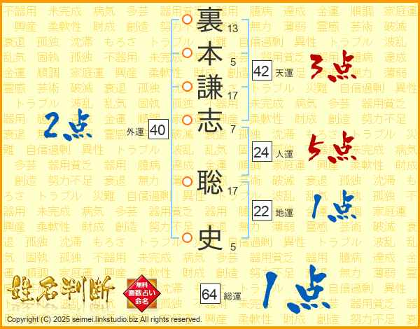 裏(13画)本(5画)謙(17画)志(7画) 聡(17画)史(5画)