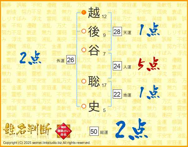 越(12画)後(9画)谷(7画) 聡(17画)史(5画)