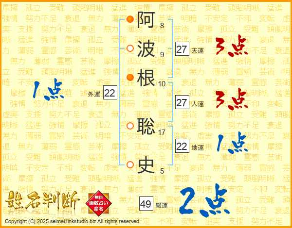 阿(8画)波(9画)根(10画) 聡(17画)史(5画)