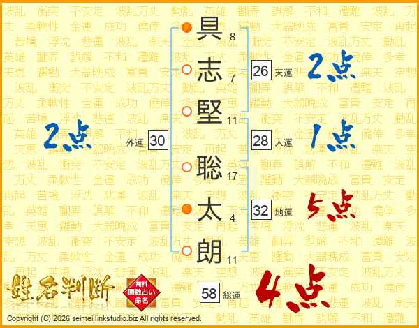 具(8画)志(7画)堅(11画) 聡(17画)太(4画)朗(11画)