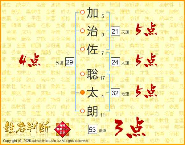 加(5画)治(9画)佐(7画) 聡(17画)太(4画)朗(11画)