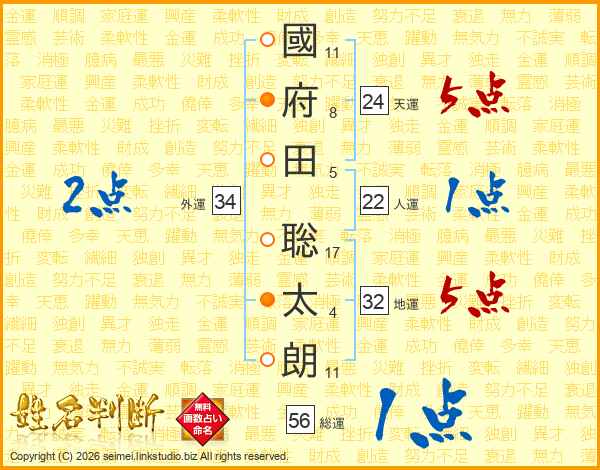 國(11画)府(8画)田(5画) 聡(17画)太(4画)朗(11画)