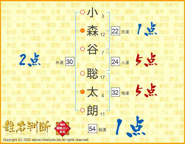 小(3画)森(12画)谷(7画) 聡(17画)太(4画)朗(11画)