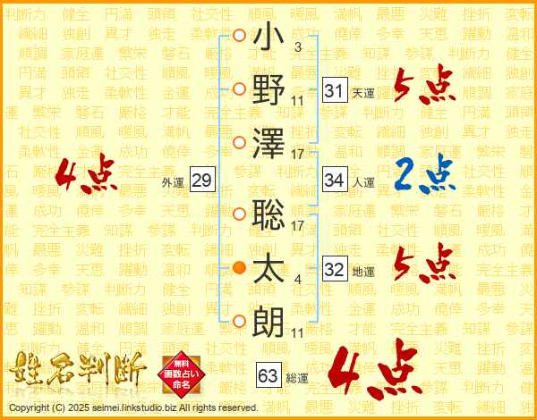 小(3画)野(11画)澤(17画) 聡(17画)太(4画)朗(11画)
