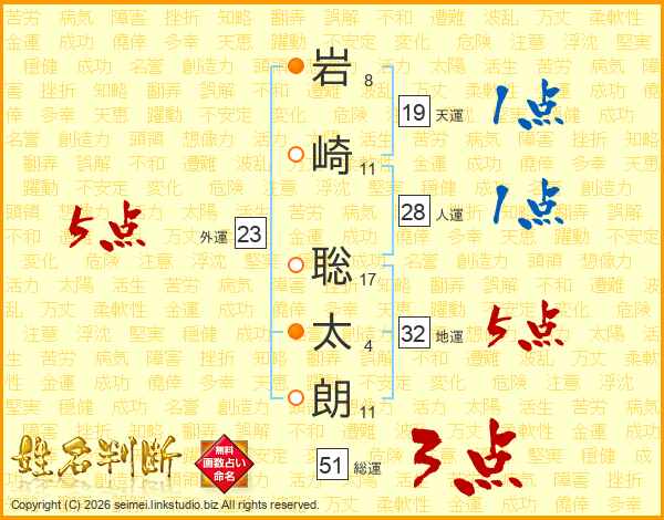岩(8画)崎(11画) 聡(17画)太(4画)朗(11画)