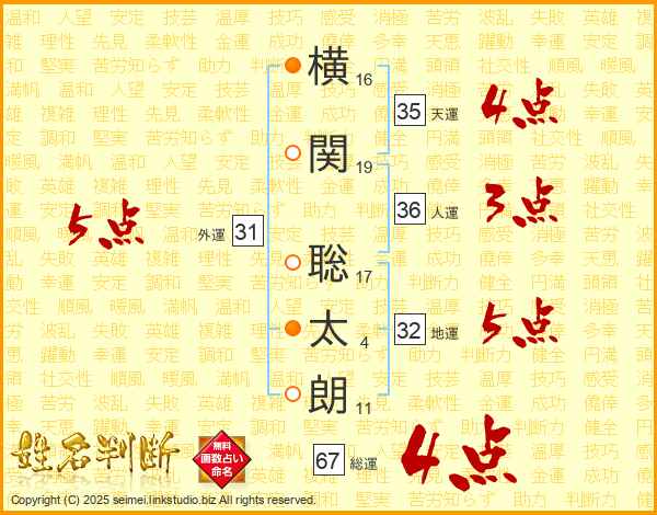 横関聡太朗さんの総運は67画の4点!