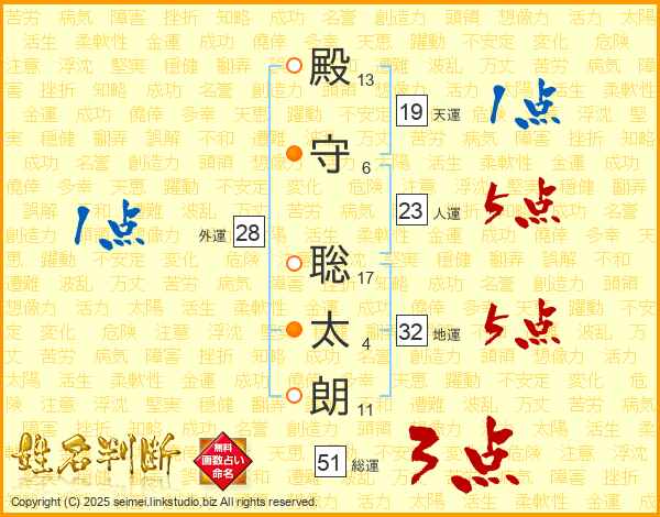 殿(13画)守(6画) 聡(17画)太(4画)朗(11画)