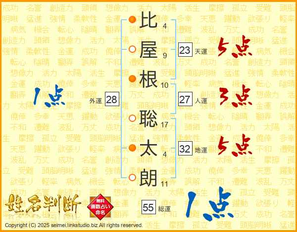 比(4画)屋(9画)根(10画) 聡(17画)太(4画)朗(11画)