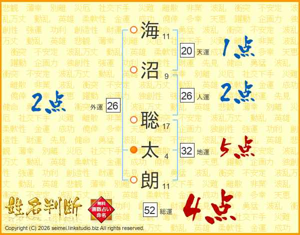 海(11画)沼(9画) 聡(17画)太(4画)朗(11画)