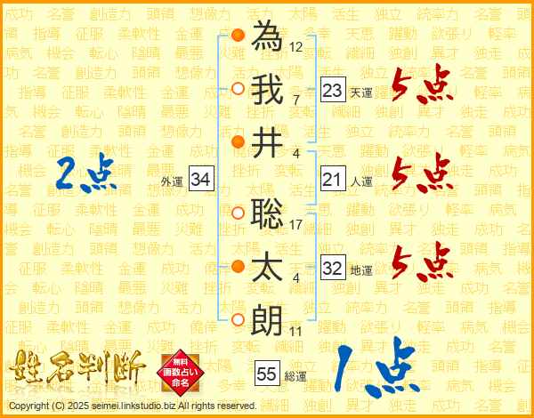為(12画)我(7画)井(4画) 聡(17画)太(4画)朗(11画)
