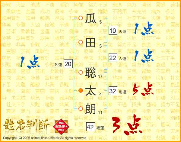 瓜(5画)田(5画) 聡(17画)太(4画)朗(11画)