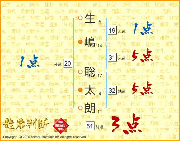 生(5画)嶋(14画) 聡(17画)太(4画)朗(11画)
