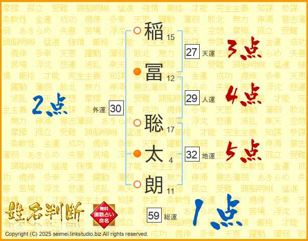 稲(15画)冨(12画) 聡(17画)太(4画)朗(11画)