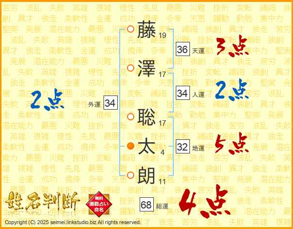藤(19画)澤(17画) 聡(17画)太(4画)朗(11画)