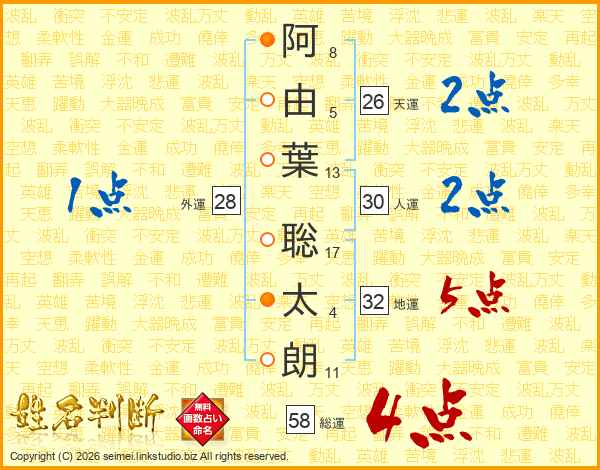 阿由葉聡太朗さんの総運は58画の4点!