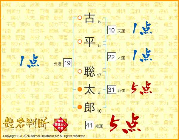 古(5画)平(5画) 聡(17画)太(4画)郎(10画)