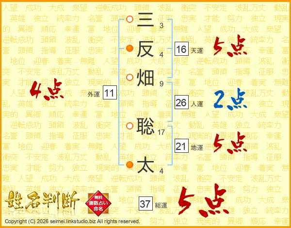 三(3画)反(4画)畑(9画) 聡(17画)太(4画)