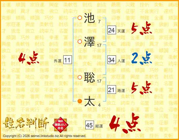 あなたの人生を表す1番重要な運勢です。生涯を通じて影響する総合運となり、主に50歳以降の晩年期に影響を及ぼします。苗字と名前の合計画数。