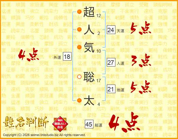 超(12画)人(2画)気(10画) 聡(17画)太(4画)
