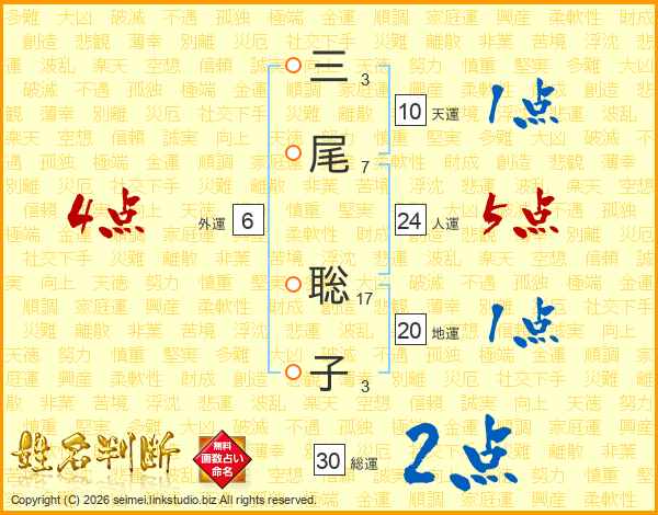 生活面を象徴する運勢です。外部から受ける影響力を表し、結婚運、家庭運や職場、環境への順応性を表します。総運から人運を引いた画数。姓や名が1文字の場合を除く。
