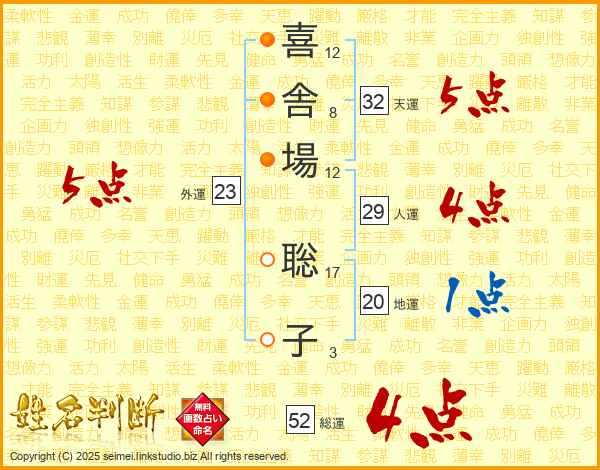 喜(12画)舎(8画)場(12画) 聡(17画)子(3画)