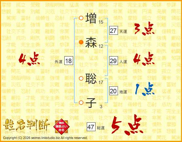 増(15画)森(12画) 聡(17画)子(3画)