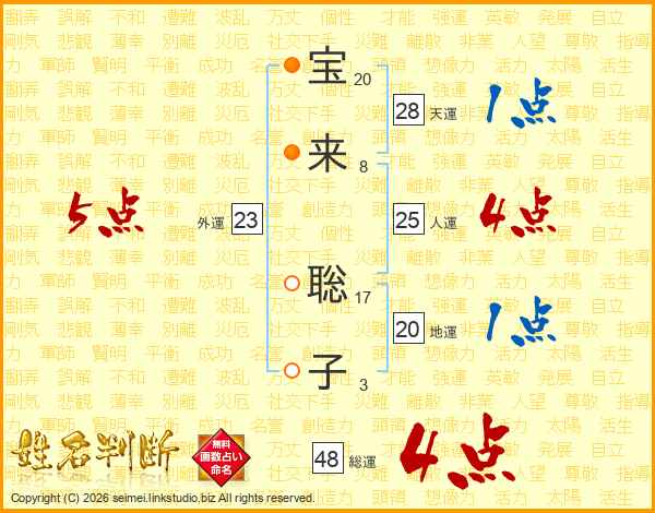 生活面を象徴する運勢です。外部から受ける影響力を表し、結婚運、家庭運や職場、環境への順応性を表します。総運から人運を引いた画数。姓や名が1文字の場合を除く。