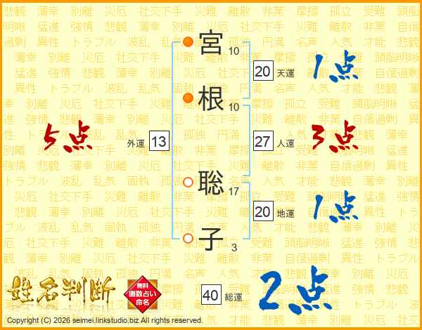 宮(10画)根(10画) 聡(17画)子(3画)