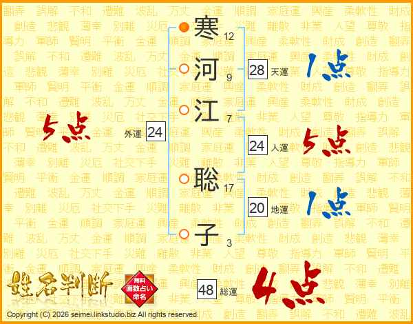 寒(12画)河(9画)江(7画) 聡(17画)子(3画)