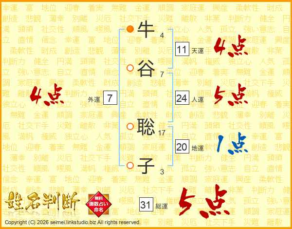 牛(4画)谷(7画) 聡(17画)子(3画)