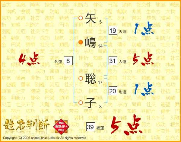 矢(5画)嶋(14画) 聡(17画)子(3画)